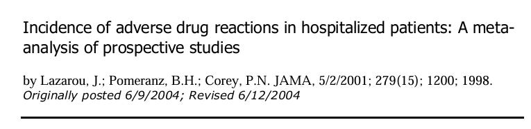Conclusions. -The incidence of serious and fatal ADRs in US hospitals was found to be extremely high. While our results must be viewed with circumspection because of heterogeneity among studies and small biases in the samples, these data nevertheless suggest that ADRs represent an important clinical issue. JAMA. 1998;279:1200-1205