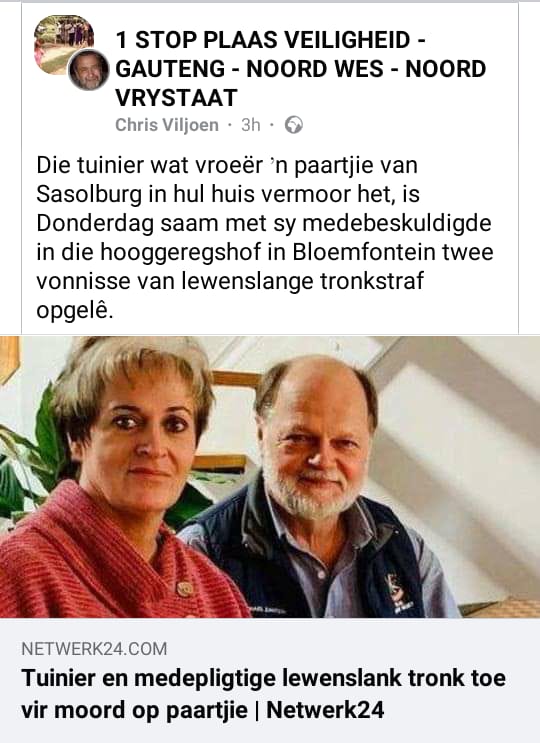 Home › Forums › ATTACKS AND MURDERS ON OUR SOUTH AFRICAN FARMERS. › Elderly Sasolburg couple hacked to death with an axe in robbery plot, gardener involved-GARDENER GETS LIFE IN PRISON