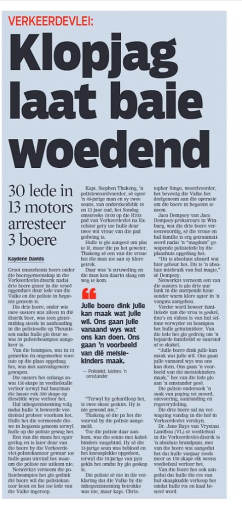 Home Forums ATTACKS AND MURDERS ON OUR SOUTH AFRICAN FARMERS. KLOPJAG LAAT BAIE WOEDEND-VERKEERDEVLEI-30 PEOPLE IN 13 CARS ARREST 3 FARMERS