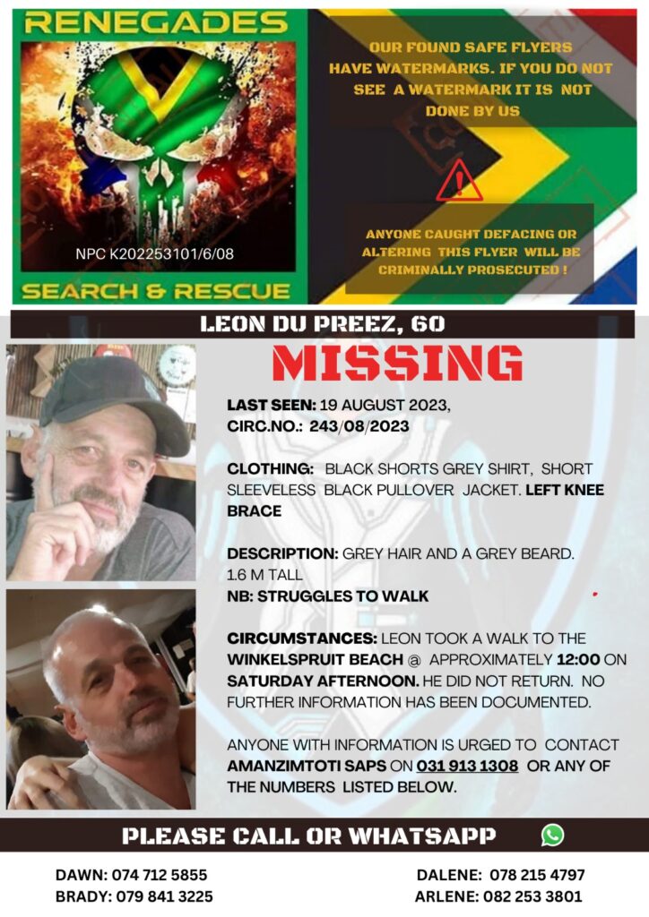 MISSING ADULT-LEON DU PREEZ-60 YEARS OLD Home › Forums › ⚖️ CRIME INVESTIGATION LIST ⚖️ › MISSING ADULT-LEON DU PREEZ-60 YEARS OLD This topic is empty. Viewing 1 post (of 1 total) Author Posts 2023-08-21 at 18:19 #417144 Nat QuinnKeymaster Author Posts Viewing 1 post (of 1 total) You must be logged in to reply to this topic. Log In Username: Password: Keep me signed in Log In